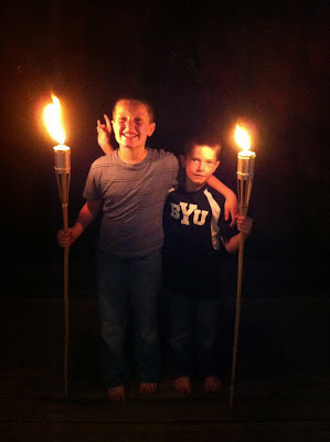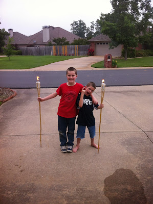 I helped at Relay for Life this year on May 17th and 18th. We had the theme of Going Coconuts. The boys got these left over torches from our decorations. They couldn't wait to use them.